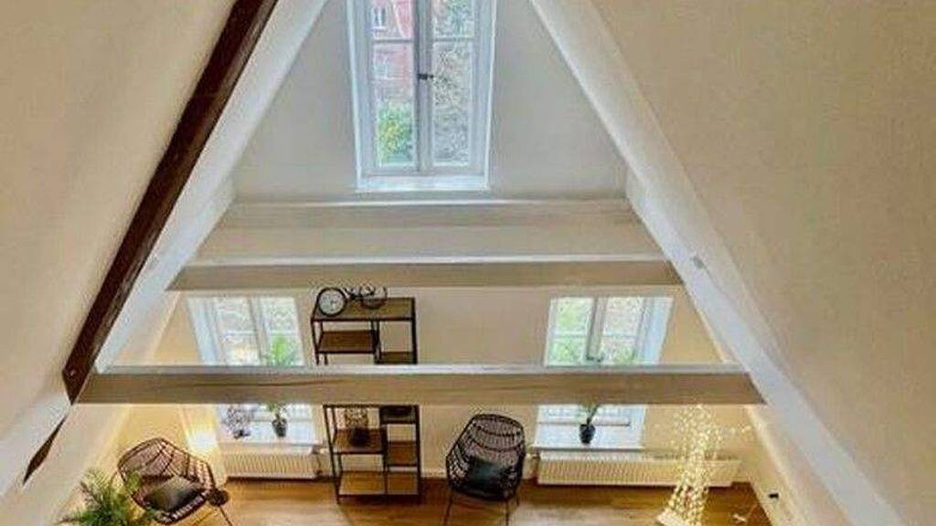Das zum Verkauf stehende Dachatelier im 2. OG besticht durch seine lichtdurchflutete Raumkonzeption mit freier Sicht auf Dachbalken in elegantem Weiß. Der honigfarbene Parkboden sorgt bereits bei Betreten für ein behagliches Wohlfühlambiente.
