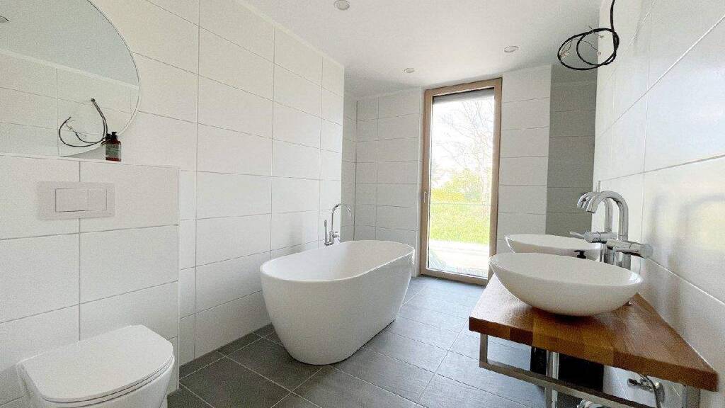 Das Badezimmer ist mit einer modernen Dusche und einer Badewanne ausgestattet und bietet Raum für Wellness und Erholung. Ein separates WC sorgt für zusätzlichen Komfort im Alltag.