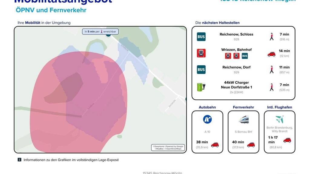 Über die nahegelegenen Bundesstraßen besteht eine zügige Anbindung Richtung Berlin sowie nach Strausberg mit S-Bahnanbindung nach Berlin. Die ca. 50 km entfernte Hauptstadt ist auch mit PKW in etwa einer Stunde erreichbar und macht den Standort besonders attraktiv für Berufspendler, die Ruhe im Grünen schätzen, ohne auf die Nähe zur Metropole verzichten zu wollen. Auch der öffentliche Nahverkehr ist über regionale Busverbindungen gewährleistet.