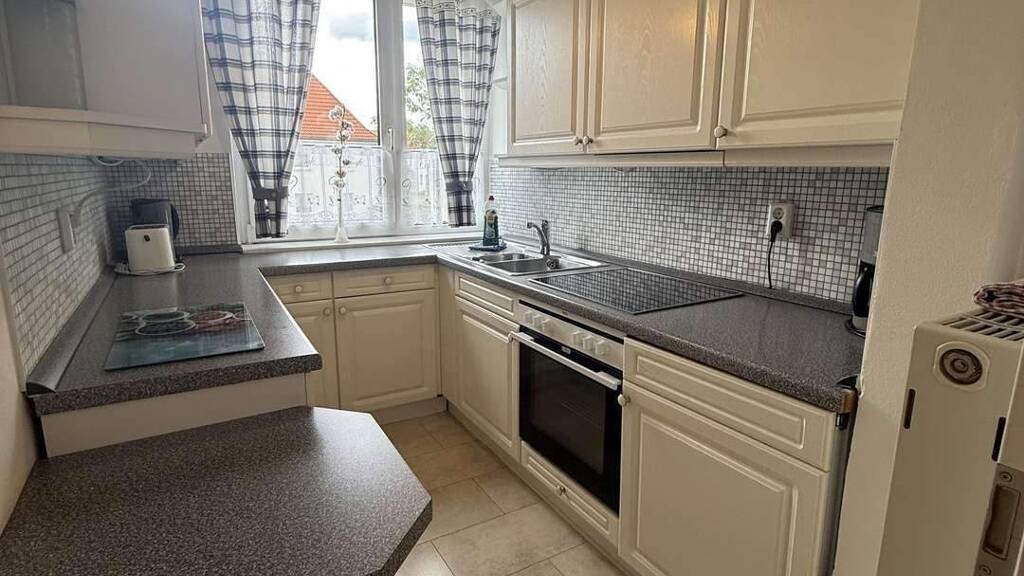 Die zweite Wohnung befindet sich im 3. Obergeschoss und verfügt über einen Balkon, der mit einer Markise ausgestattet ist. Mit ca. 59 m² Wohnfläche und insgesamt drei Zimmern bietet sie etwas mehr Raum und eignet sich ideal für Familien oder längere Aufenthalte. Im Schlaf- und Kinderzimmer gibt es jeweils zwei Betten, ein Kleiderschrank sowie zwei Nachtschränke. Das Wohnzimmer ist mit einer großzügigen Wohnlandschaft in U-Form, einer Wohnzimmerwand und einem Fernseher eingerichtet. Der Essbereich umfasst einen weißen Esstisch mit vier Stühlen. Die Küchenzeile bietet alles, was für den täglichen Bedarf benötigt wird: Herd, Kühlschrank, Geschirr, Gläser, Besteck, Töpfe sowie Kleingeräte wie Kaffeemaschine, Wasserkocher und Toaster. Das Badezimmer ist ebenso wie in der kleineren Wohnung mit einem Spiegelschrank samt Beleuchtung und einer Badewanne mit Duschtrennwand ausgestattet. Gardinen, Lampen, Bettwäsche sowie Hand- und Duschtücher sind vollständig vorhanden. Besonders praktisch: Diese Wohnung verfügt zusätzlich über Rollläden.
