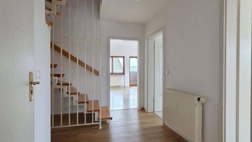 Bereits beim Betreten überzeugt die Wohnung durch helle, freundliche Räume und eine angenehme Wohnatmosphäre. Der großzügige Wohn- und Essbereich bildet das Herzstück der unteren Ebene und bietet dank großer Fensterflächen viel Tageslicht sowie einen direkten Zugang zur Loggia. Von hier aus genießen Sie einen schönen Weitblick, der zu entspannten Stunden im Freien einlädt. Die vorhandene Einbauküche ist funktional gestaltet und fügt sich harmonisch in das Gesamtbild ein.