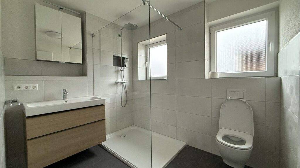 Das Badezimmer ist mit einer Dusche, einem Handwaschbecken sowie einem WC ausgestattet und präsentiert sich modern und praktisch zugleich. Eine Gegensprechanlage mit Live-Bild sorgt zusätzlich für Komfort und Sicherheit.