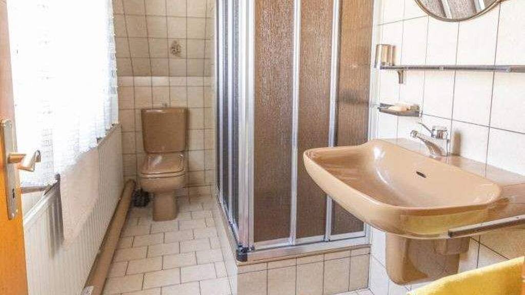 * Das zweite Bad im Obergeschoss ist ebenfalls mit einer Dusche ausgestattet; letzte Erneuerung der Fliesen hier in den 80er Jahren