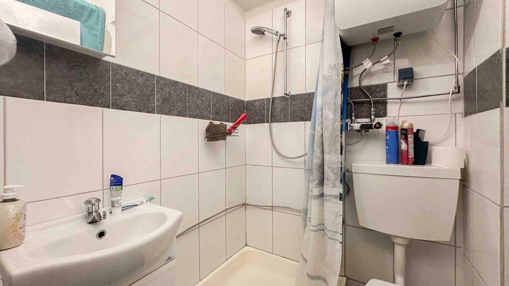 Der Wohn- Schlafbereich mit Küchennische ist großzügig gestaltet und bietet Zugang zum Balkon - perfekt für ein paar entspannte Minuten an der frischen Luft. Das Badezimmer verfügt über eine Dusche.