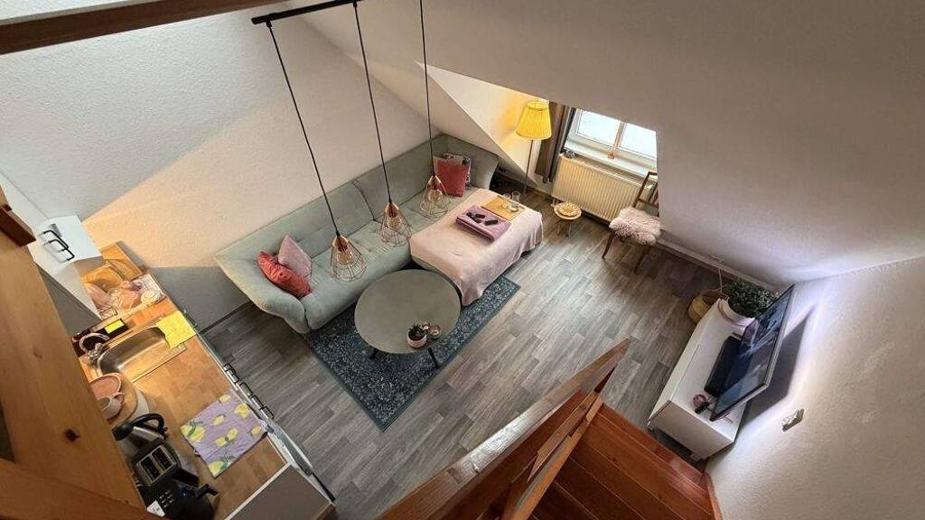 Auf rund 32 m² Wohnfläche überzeugt die Wohnung mit einem offenen Wohn- und Essbereich inklusive integrierter Küchenzeile. Der moderne Design-Vinylboden verleiht dem Raum ein zeitgemäßes und wohnliches Ambiente. Über eine Treppe gelangt man auf die Empore, die aktuell als Schlafbereich genutzt wird und den vorhandenen Wohnraum optimal ergänzt. Ein kleiner Flur mit praktischem Einbauschrank sowie ein hell gefliestes Duschbad komplettieren den gut durchdachten Grundriss.