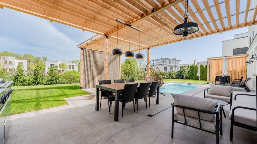 Built in 2020, this villa in Potsdam combines luxurious furnishings and sophisticated architecture at the highest level. The open-plan concept on the first floor creates a spacious and modern feeling of living, which is perfectly rounded off by fine materials such as oak herringbone parquet and marble flooring. The Miele kitchen with cooking island and triple-glazed wooden windows create an elegant yet functional atmosphere. The spacious rooms with ceiling heights of 3.05 m on the first floor offer a special expanse. The view of the well-tended south-west-facing garden and the terrace with outdoor kitchen and Weber barbecue create a luxurious retreat. The swimming pool, equipped with solar technology and a heat pump, can be used all year round.