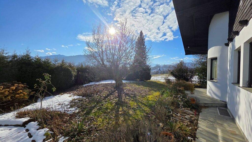 Dieses gepflegte Einfamilienhaus bietet auf einer Ebene im Erdgeschoss rund 135 m² barrierefreie Wohnfläche und verbindet eine ruhige Wohnlage mit zentrumsnaher Infrastruktur. Das 1.013 m² große, eben gelegene Grundstück mit liebevoll angelegtem Garten und altem Baumbestand sorgt für Privatsphäre und eine grüne Wohlfühlatmosphäre. Der Blick in die beeindruckende Gebirgswelt ist aktuell durch eigene Sträucher und Bäume leicht abgeschirmt - wer mehr Panorama wünscht, kann dieses mit wenigen Handgriffen deutlich erweitern.