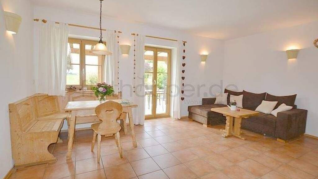 Am typisch ländlichen Essbereich fühlt man sich gleich in Bayern angekommen. Ergänzt wird dieser Raum mit der offenen Küche und dem Wohnbereich. Von hier aus gelangen Sie auf die überdachte Terrasse mit Westausrichtung und den Garten (wird von zwei Wohnungen genutzt).