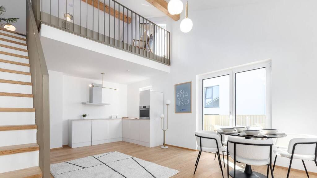 Das Highlight dieser 3,5-Zimmer Galeriewohnung ist die Möglichkeit, den Wohnbereich auf zwei Ebenen zu gestalten. Der ca. 30 m² große Koch- und Essbereich bietet viel Platz für die ganze Familie und darüber hinaus Zugang zu einem von zwei Balkonen. Die ca. 20 m² große und dank bodentiefer Fenster sehr helle Galerie erweitert den Wohnbereich zusätzlich in das Dachgeschoss und gewährt mit angrenzendem Dachboden wertvollen Stauraum. Die Möglichkeit für eine hohe Wohnbauförderung runden das Angebot dieser einzigartigen Wohnung ab.