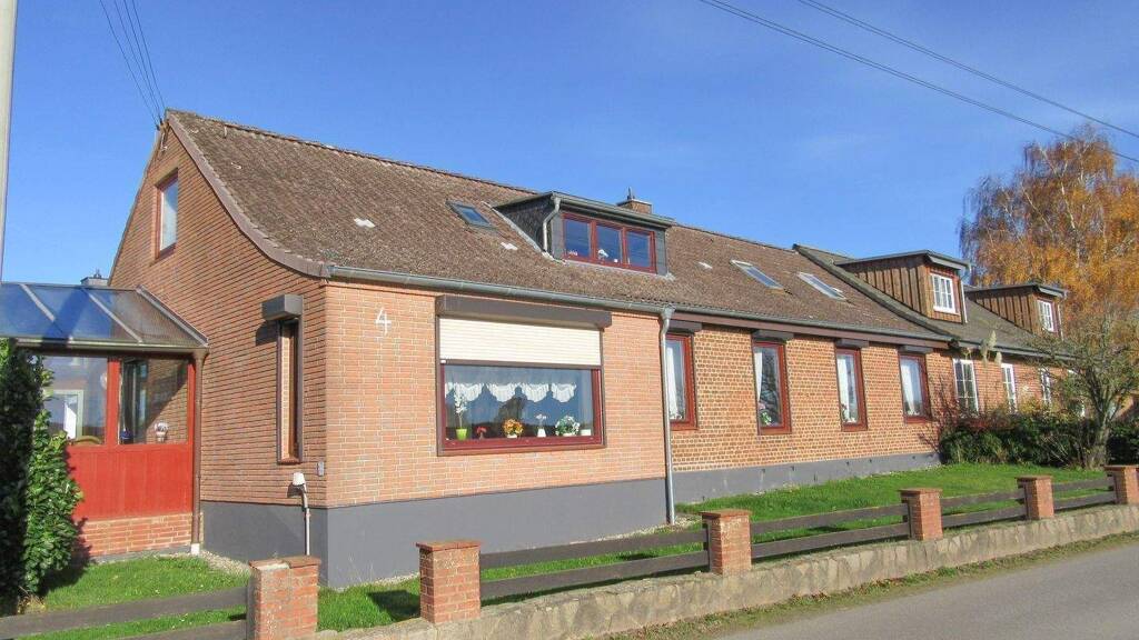 Das Wohnhaus verfügt insgesamt über 6 Zimmer. In der Vergangenheit wurde das Haus innerhalb der Familie mit 2 Parteien bewohnt, die gemeinsam das mittig liegende Duschbad genutzt haben. Daher befinden sich auf der einen Seite des Hauses 4 Zimmer, verteilt über Erd- und Dachgeschoss mit Küche und Ausgang in den Wintergarten und eigenem Eingang und auf der anderen Seite des Hauses 2 Zimmer mit Küche, Speisekammer und eigenem Eingang über den Windfang. Eventuell könnte hier noch ein zusätzliches Bad eingerichtet werden, so dass die Immobilie in 2 vollständige Wohnungen aufgeteilt werden könnte.