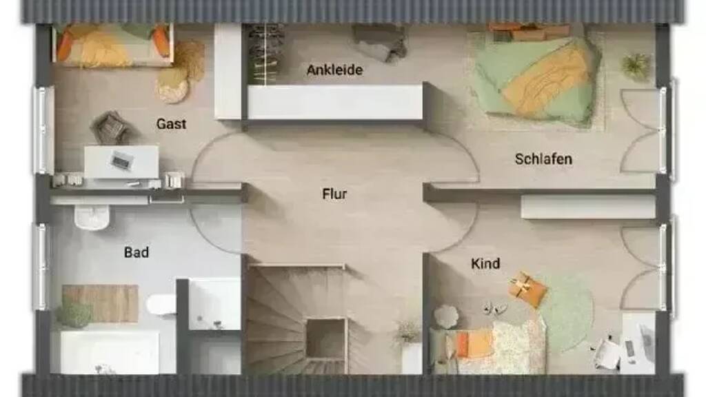 Das großzügige Haus mit dem schönen Satteldach überzeugt mit viel Platz und einem variablen Grundriss. Das Wohnzimmer schenkt genügend Raum zur Erholung, die sich anfügende Essecke wird schnell zum gemütlichen Familienmittelpunkt mit direktem Zugang zur Küche. Die hohen Fenster fangen das Tageslicht besonders gut ein. Jeder Raum im Haus wirkt offen und freundlich. Ein Arbeits- oder Kinderzimmer und das Gäste-WC runden das Erdgeschoss perfekt ab.