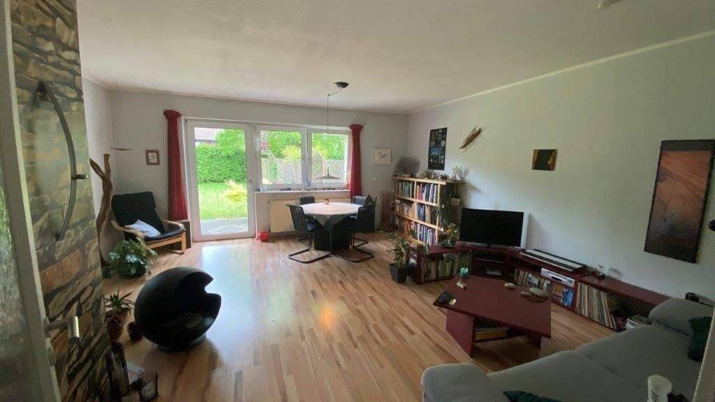 Im Erdgeschoss der Doppelhaushälfte befindet sich eine Dreizimmer- Wohnung mit ca. 80,08 m². Zu der Erdgeschosswohnung gehört eine mit ca. 25qm überdimensionierte Garage (reichlich Platz für Fahräder, Motorrad oder Gartenmöbel) und ein großer im Sommer blickgeschützter Garten.