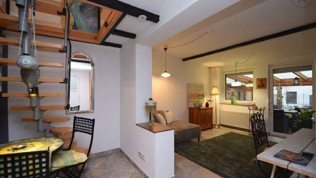 Verkehrsgünstig zwischen den Metropolen Köln und Düsseldorf, mit guter Anbindung an den Chempark Leverkusen gelegen, bietet dieses kleine Häuschen in ruhiger Gartenlage angenehmes und entspanntes Wohnen für eine Einzelperson. Über den Hof ist der separate Eingang der hübschen Villa Winzig zugänglich. Vom Eingangsbereich zweigt das separate WC und das Duschbad mit ebenerdiger Dusche ab. Beide sind natürlich belichtet und belüftet. Bunte Fliesenspiegel und farbige Armaturen verleihen dem Bad ein frisches und peppiges Ambiente. Der gemütliche Wohnraum ist mit einer Recamiere mit Cordstoff, einem Schreibtisch und Regalelementen mit einem TV mit Sky-TV ausgestattet. W-lan ist vorhanden, ein Lesesessel wird noch zur Verfügung gestellt. Ein Highlight stellt der schöne Wintergarten (nicht beheizt) mit Holzboden dar, der die Natur direkt in den Wohnraum holt. Bodentiefe Fensterelemente lassen sich komplett öffnen und bieten so im Frühjahr und Sommer einen schönen Relaxbereich, ein Heizstrahler ist vorhanden. Ein großer Tisch lädt zum gemütlichen Beisammensein mit Freunden ein. Die Küche schmiegt sich in eine Nische, hier stehen eine Spüle, ein Cerankochfeld und Kühlschrank mit Gefrierfach zur Verfügung. Auch hier sorgt der bunte in Grüntönen gehaltene Fliesenspiegel für farbenfrohe Akzente. Ein kleiner Essplatz für 2 Personen ist unter der Wendeltreppe platziert, die zum oberen Schlafzimmer führt. Dies ist mit einem 140 x 200 Futonbett, einem schönen weißen Einbauschrank, der sich optimal in die Dachschräge einfügt und einem hübschen Holzwandpanel ausgestattet. 2 Fenster sorgen auch im Sommer für angenehme Belüftung. Eine Waschmaschine steht im Keller des Vorderhaus zur gemeinsamen Nutzung zur Verfügung. In den nahe gelegenen Sandbergen finden sich wunderschöne Waldspazierwege und Joggingstrecken. Der Ortskern von Leichlingen ist zufuß erreichbar, mit dem Bus sind es 4 Haltestellen. E-Lademöglichkeit fußläufig erreichbar