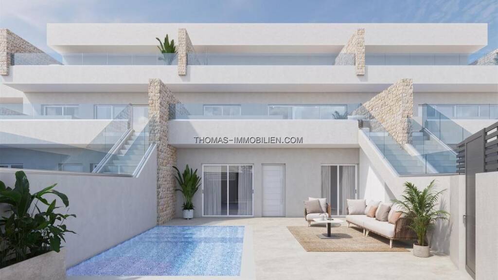 Neubauwohnungen in Pilar de la Horadada mit privatem Pool Moderne Häuser in Strandnähe Entdecken Sie diese exklusive Neubausiedlung in Pilar de la Horadada, die nur 2,5 km vom Strand entfernt Bungalows anbietet. Diese Bungalows, die auf Komfort und Stil ausgelegt sind, sind eine hervorragende Gelegenheit, das Leben an der Costa Blanca zu genießen. Geräumige und stilvolle Wohnungen Diese Anlage bietet Wohnungen mit 2 oder 3 Schlafzimmern, 2 Bädern und Privatparkplätzen. Wählen Sie aus: Bungalows im Erdgeschoss mit eigenem Garten. Bungalows im Dachgeschoss mit offener Terrasse. 1 Stadthaus mit 3 Schlafzimmern und Eckgrundstück. Jede Immobilie ist mit hochwertigen Materialien und modernen Ausstattungen gebaut, einschließlich: Alle Immobilien haben einen privaten Swimmingpool. Vorinstallation einer kanalisierten Klimaanlage. Aluminium-Außenschreinerei mit thermischer Trennung und Doppelverglasung. Sicherheitseingangstür für ein sicheres Gefühl. Aerothermisches System für eine effiziente Warmwasserbereitung. Einbauschränke in den Schlafzimmern. Privilegierte Lage in Pilar de la Horadada Pilar de la Horadada ist eine charmante spanische Stadt im südlichsten Teil der Costa Blanca. Sie bietet eine lebhafte Hauptstraße mit zahlreichen Geschäften, Supermärkten, Restaurants und malerischen Plätzen. Die herrlichen Strände von Torre de la Horadada und Mil Palmeras mit ihrem feinen, goldenen Sand und der malerischen Promenade sind nur 5 Minuten entfernt. Die Stadt bietet außerdem gut ausgebaute Rad- und Wanderwege sowie eine Vielzahl von Sportmöglichkeiten. Bequemer Zugang zu den wichtigsten Zielen Lo Romero Golfplatz - 5 km (10 Minuten Fahrt). Flughafen Corvera (Murcia) - 40 km (40 Minuten Fahrzeit). Flughafen Alicante - 55 km (55 Minuten Fahrtzeit). Einkaufszentren (La Zenia Boulevard) - 15 km (15 Minuten mit dem Auto). Torre de la Horadada Marina - 3 km (5 Minuten Fahrt). Sichern Sie sich noch heute Ihr Traumhaus Verpassen Sie nicht diese fantastische Gelegenheit, ein brandneues Haus in bester Lage zu besitzen. Kontaktieren Sie uns noch heute für weitere Informationen und um einen Besichtigungstermin zu vereinbaren.
