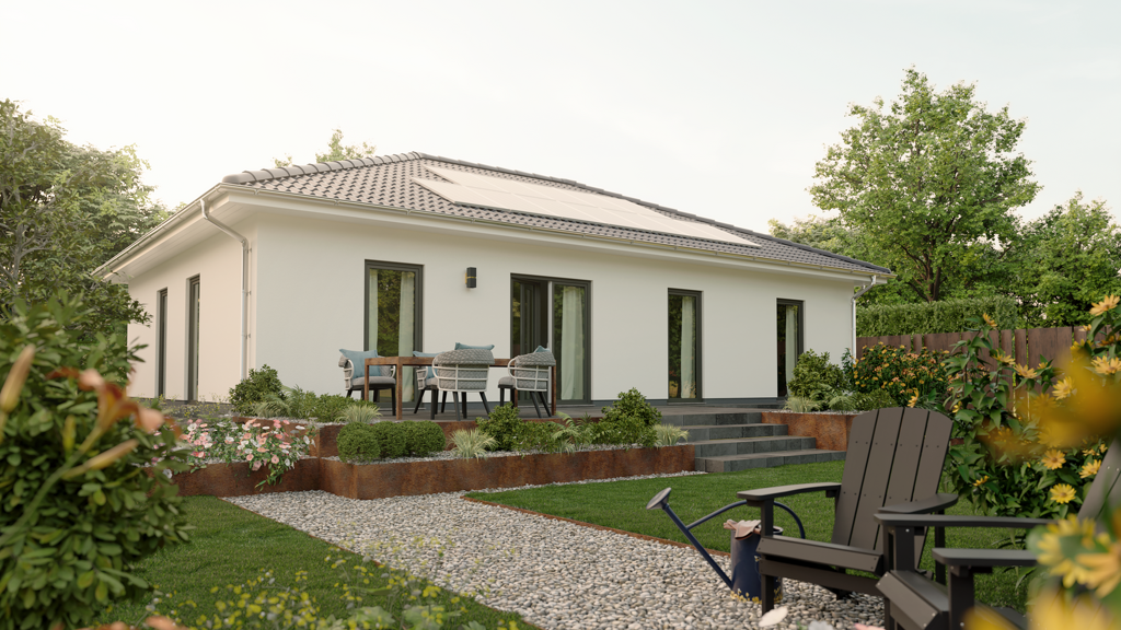 Hier spielt sich alles auf einer Wohnebene ab - Für eine Familie mit zwei Kindern ist der Bungalow 110 ein ideales Zuhause. Er bietet ein gemütliches Wohnzimmer mit Essbereich, ein geräumiges Schlafzimmer und zwei weitere Zimmer. Alle Räume sind dank großer Fenster hell und freundlich. Mit quasi einem Schritt sind Sie mit Ihren Liebsten im Garten und können die Sommerzeit bei einem Grillabend genießen.