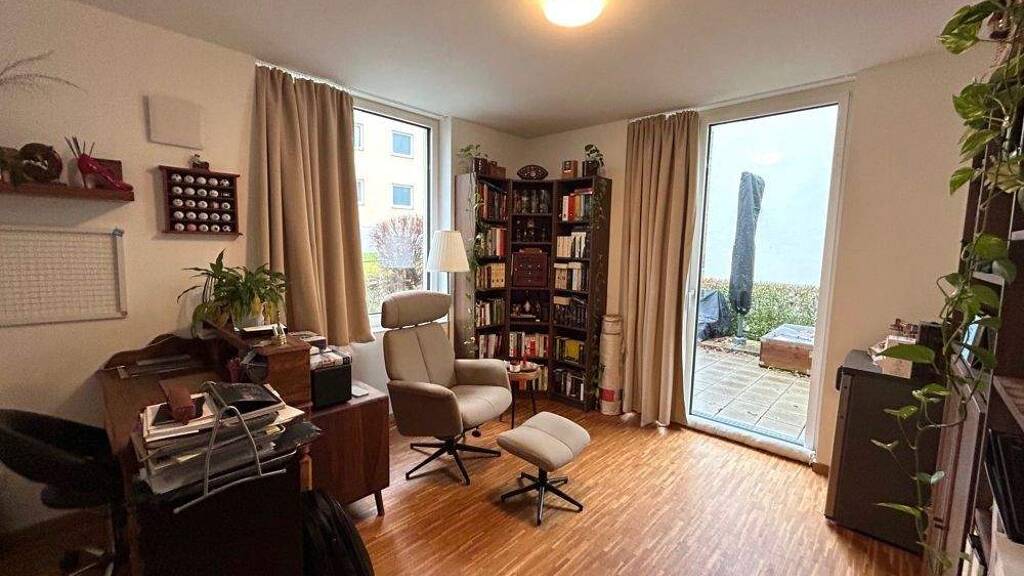 Das Wohnzimmer bietet vielfältige Gestaltungsmöglichkeiten und schafft eine angenehme Wohnatmosphäre. Ein weiteres Zimmer eignet sich ideal als Büro oder Homeoffice und verfügt über einen direkten Zugang zur Terrasse. Auch das Schlafzimmer bietet ausreichend Platz für individuelle Einrichtungsideen.