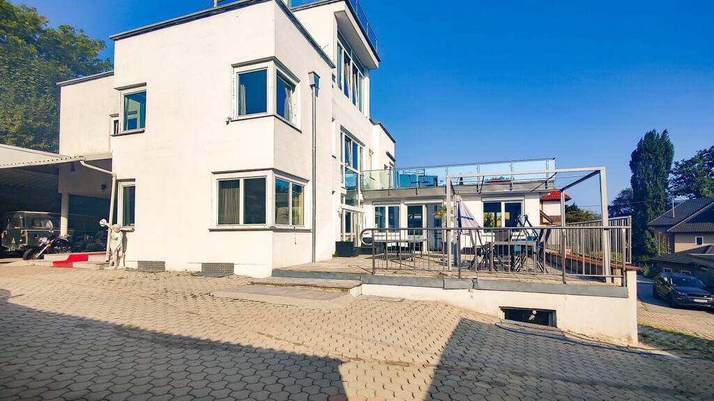 Ergänzt wird das Haus durch eine Vielzahl von Nebenflächen: eine große Tiefgarage, eine separate Garage, ein Carport mit 114 m² Fläche sowie eine eigene Werkstätte mit Hebebühne.