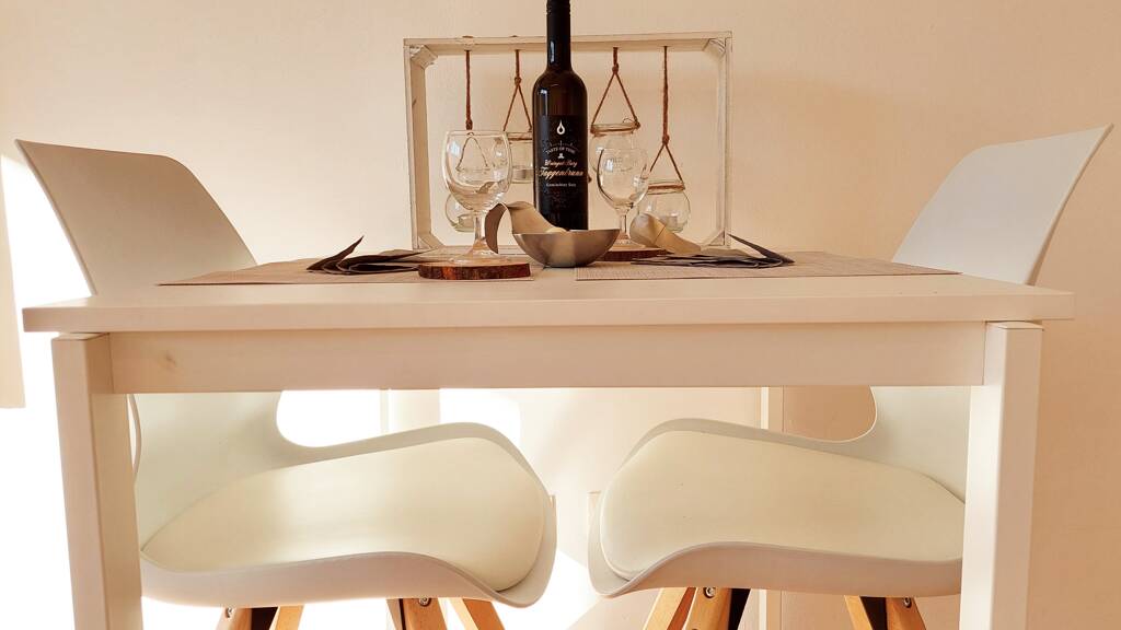 Im freundlich gehaltenen Wohn-Essbereich mußt du dich um nichts mehr kümmern außer um dich selbst. Am Esstisch kannst du bei leckerem Essen und einem guten Glas Wein den Tag ausklingen lassen, auf der mit reichlich Kissen bestückten Couch die Seele baumeln lassen oder dich bei einem guten Café an der Bar aufhalten.