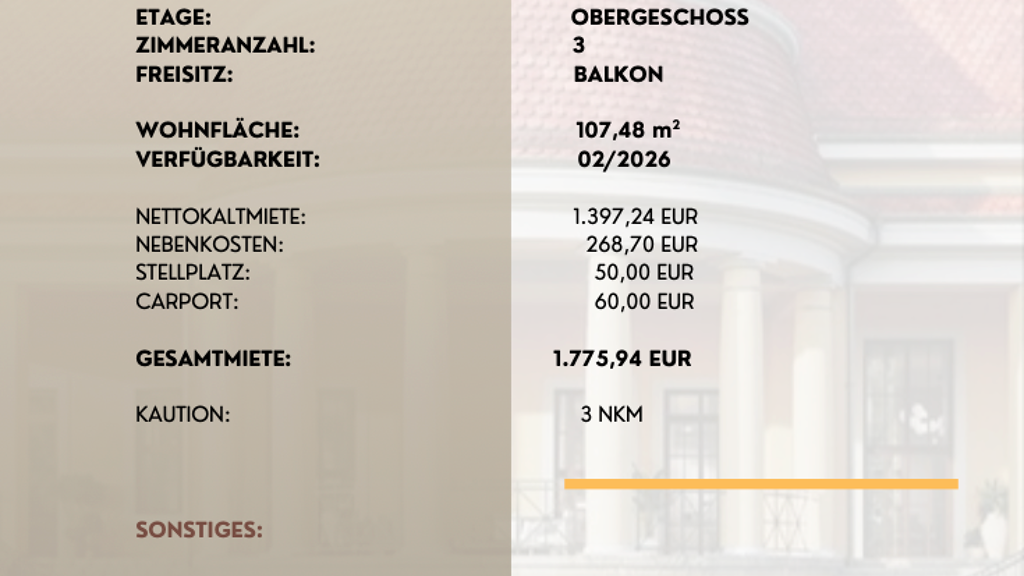 Dieses Exposé ist eine Vorabinformation, als Rechtsgrundlage gilt alleine der abgeschlossene Mietvertrag. Haftungsausschluss: Trotz regelmäßiger Prüfung von Daten, Bildern und Informationen übernehmen wir keine Haftung für die Richtigkeit der Angaben. Ebenso wenig für die Verfügbarkeit des Angebotes bei Vermietung.