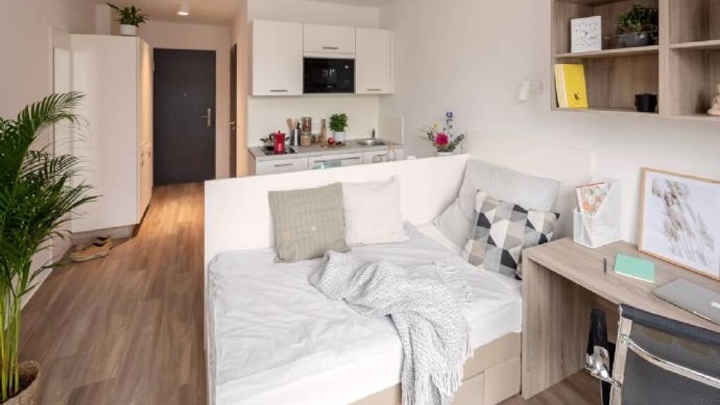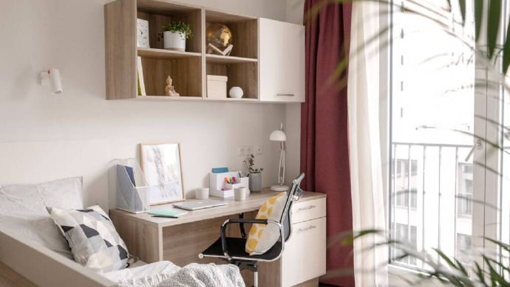 • Wohn- und Arbeitsbereich: Bett inkl. Matratze, Schreibtisch mit Stuhl, Garderobe mit Spiegel, lichtdichte Vorhänge, Gegensprechanlage und generell extra viel Stauraum