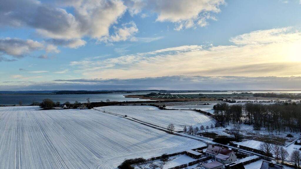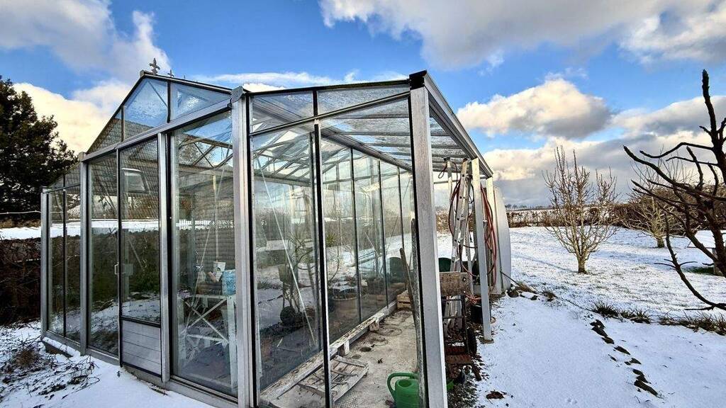 Das weitläufige Grundstück bietet viel Privatsphäre und umfasst Gartenflächen, ein Doppel-Carport, eine massiv errichtete Doppel-Garage mit separatem Lagerraum sowie ein Gewächshaus. Die offene Umgebung mit freiem Blick bis zum Bodden prägt den Charakter der Lage.