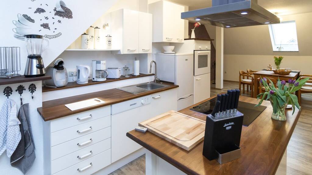 Die modern eingerichtete Ferienwohnung befindet sich über den Gewerbeeinheiten und ist über eine außen liegende Wendeltreppe oder das innen liegende Treppenhaus erreichbar. Sie bietet ein großzügiges, helles Esszimmer mit offener Küche und Zugang zur sonnigen Dachterrasse, ein Badezimmer mit Dusche, ein separates WC, 2 Schlafzimmer sowie ein Wohnzimmer. Im zentralen Bereich der Wohnung befindet sich eine Klimaanlage.