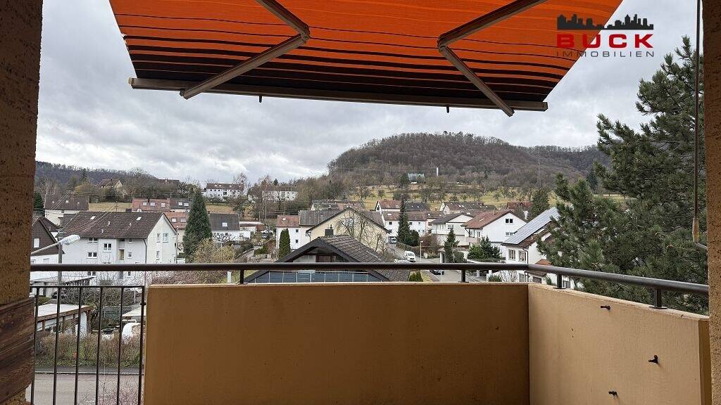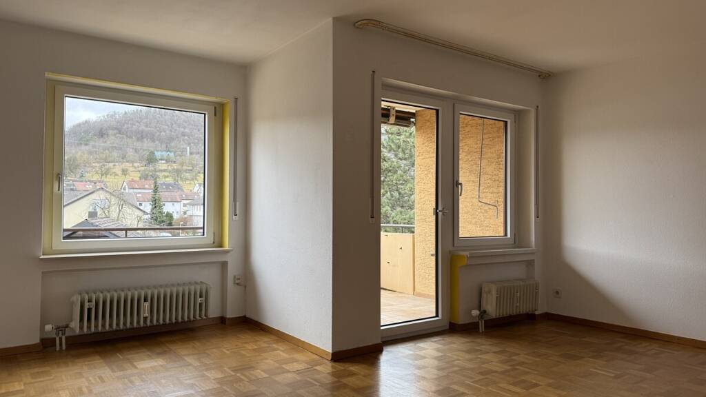 Im Inneren erwarten Sie zwei gut geschnittene Zimmer, darunter ein Schlafzimmer und ein großzügiges Wohnzimmer mit direktem Zugang zum Südwest-Balkon. Hier können Sie sich entspannen und die herrliche Aussicht genießen. Die Wohnung verfügt aktuell über eine zweckmäßige Einbauküche, ein Gäste-WC, ein Abstellraum und ein raumhoch gefliestes Badezimmer mit Dusche und Badewanne.