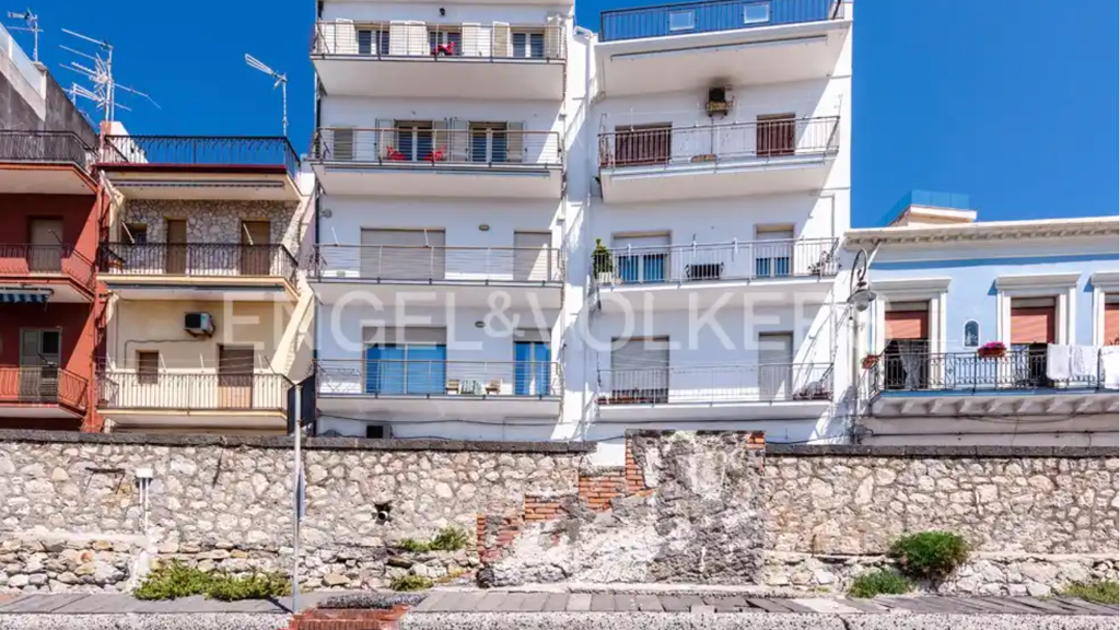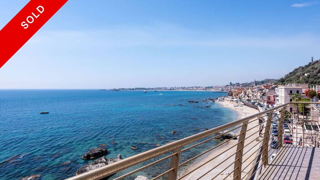 Diese wunderschöne Panorama-Wohnung befindet sich in der begehrtesten Strandlage von Giardini Naxos, zwischen Piazza Municipio und Porticciolo Saya. Die Wohnung auf zwei Ebenen befindet sich im dritten und vierten Stock eines kleinen Gebäudes mit fünf Stockwerken mit atemberaubenden Blick auf das Meer, direkt vor einem kleinen freien Strand und dem Gehweg entlang des Meeres, der angenehme Spaziergänge zum Hafen von Naxos ermöglicht. Im dritten Stock öffnet sich der Eingang zum großen Wohnzimmer mit Ausgang auf den langen Balkon mit Panoramablick, die Wohnküche, ebenfalls mit Zugang zum Balkon, und ein Badezimmer; eine Innentreppe führt ins Obergeschoss, wo ein großer Flur zum zweiten Badezimmer und zu den beiden Schlafzimmern führt, eines mit Fenster und das andere mit Zugang zum zweiten Balkon, ebenfalls mit Meerblick.