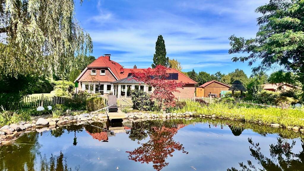 In der reizvollen Parklandschaft Ammerland steht im südlichen Teil der Gemeinde Wiefelstede dieses eindrucksvolle Landhaus- Anwesen mit Nebengebäuden zum Verkauf an. In zentraler und begehrter Wohngebietslage liegt diese Immobilie an einer besonderen Adresse auf einem eindrucksvollen und malerischen Gartengrundstück zur Größe von 5.426 m². Das Haupthaus wurde ursprünglich im Jahre 1951 errichtet. 1986 wurde diese Immobilie von den jetzigen Eigentümern erworben und in umfangreicher Weise umgebaut und durch den Anbau erweitert. Das Wohnhaus unterteilt sich im Erdgeschoss in einen lichtdurchfluteten Wohnbereich mit Kaminofen sowie Panoramafenster und idyllischem Ausblick in die Gartenanlage, eine großzügige Wohnküche inkl. neuwertiger Einbauküche und Erkerbereich, ein geräumiges Schlafzimmer mit angrenzendem Badbereich, ein neu gestaltetes Gäste- WC, ein praktikabler Hauswirtschaftsraum, einen Abstellraum sowie Vorratsraum, Diele mit Treppenaufgang ins Obergeschoss sowie Flurbereiche. Weiterhin verfügt die Erdgeschossebene über eine integrierte Garage mit elektrischem Tor sowie Montagegrube (kann als Wohnraum ausgebaut werden) sowie eine Werkstatt mit eigenem Eingangsbereich. Vom Wohnbereich aus gelangen Sie auf die rückwärtige Terrasse als auch zu dem eindrucksvollen Wintergarten- Pavillon mit faltbaren Fensterelementen. Dieser Wintergarten lädt bei geöffneten Fenstern inmitten der Natur zum Verweilen ein; aber auch bei kühlen Temperaturen verzaubert der achteckige Wintergarten-Pavillon durch seinen Kaminofen eine behagliche Wohlfühlatmosphäre.