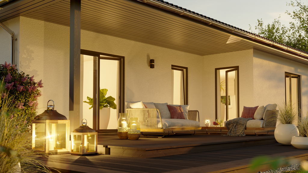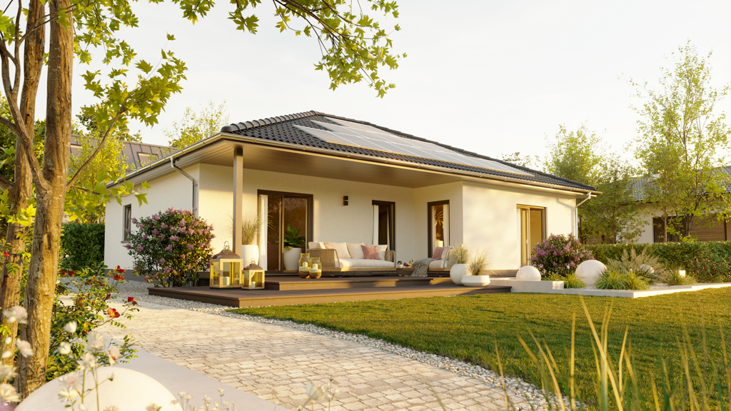 Wohnglück ohne Hindernisse - Dieser Bungalow fällt nicht nur durch sein charmantes Design auf. Die markante Winkelform ermöglicht auch einen variablen Grundriss. Die besondere Raumanordnung des Winkelbungalows 108 sowie die vielen kleinen Details machen das Wohnen für Sie zum Genuss.