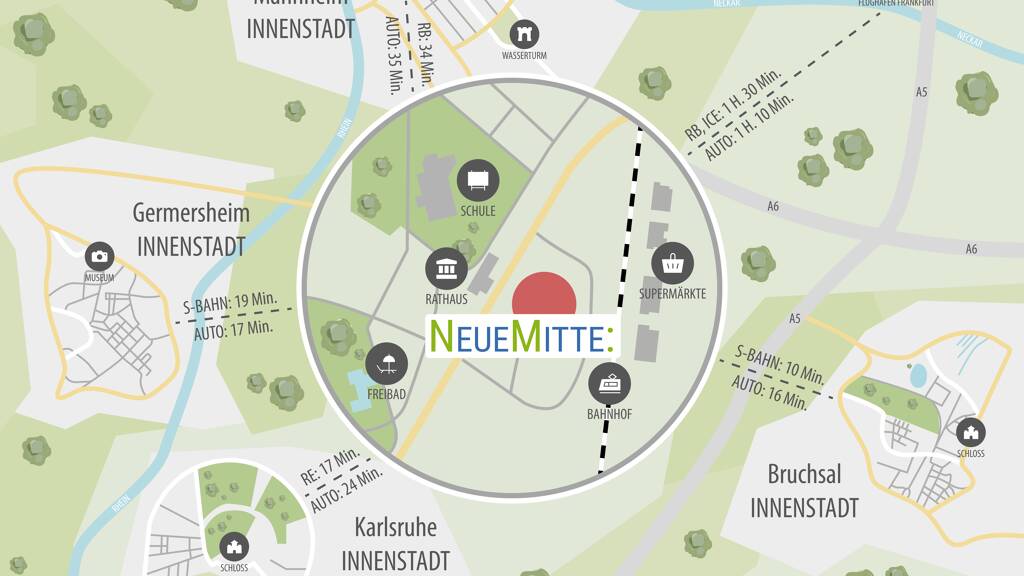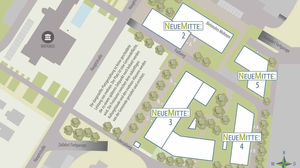 Das Quartier NEUEMITTE in Graben-Neudorf liegt direkt an der Hauptstraße gegenüber dem Rathaus und Schulzentrum.