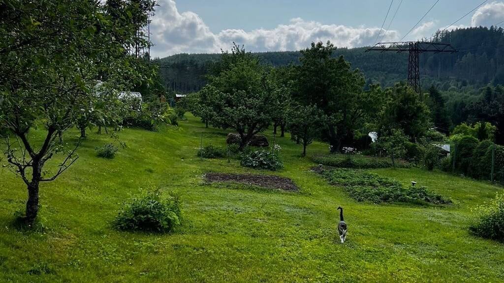 Im vorderen Teil des Grundstücks befindet sich das charmante Gartenhaus mit kleiner Küche, dem Wohn- und Schlafzimmer und einem Spitzboden, der als Schlafboden für die Kinder genutzt wurde. Ein kleiner Ofen sorgt auch an kalten Tagen für ein warmes Häuschen. Vor dem Häuschen befindet sich eine große Terrasse, die zum Verweilen einlädt. Das Waschhaus ist im Blockhausstil erbaut und mit Warmwasserboiler, Dusche und Toilette ausgestattet. Bei Bedarf kann in dem Blockhaus auch noch eine Sauna eingebaut werden, der dafür benötigte Starkstromanschluss ist vorhanden. Im Holzschuppen können alle Gartengeräte untergebracht werden. Der große und mit Bedacht angelegte Garten verfügt über Äpfel- und Kirschbäume, über Stachelbeer- und Johannisbeersträucher, sowie Erdbeerbeete und eine große Rhabarberstaude. Das Nachbargrundstück verfügt über eine eigene Quelle, das überlaufende Wasser wird in einem kleinen Teich auf dem Grundstück aufgefangen und kann zum Gießen der Pflanzen verwendet werden. Das Grundstück ist gänzlich umzäunt und verfügt über eine Toreinfahrt, sodass das Auto auch zum Be- und Entladen auf das Grundstück gefahren werden kann. Am unteren Zaun könnte eine Gartentür eingebaut werden, sodass man den Schwimmteich in 3 Minuten zu Fuß erreichen kann.