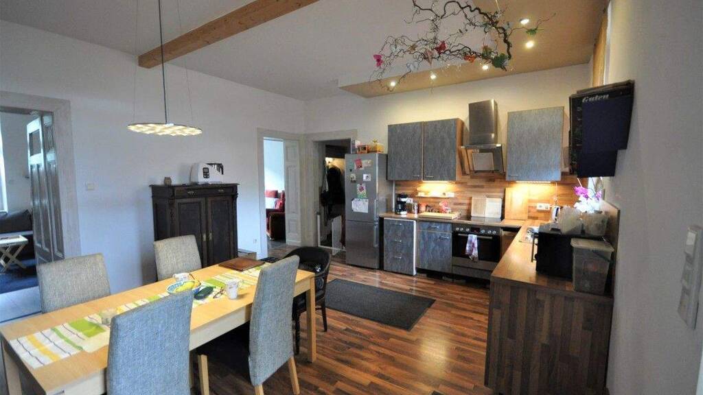 Über den Eingangsflur der Wohnung erreichen Sie u.a. die sehr großzügige Wohnküche. Hier findet neben der geräumigen Küche ein großer Esstisch Platz. Vom Flur aus erreichen Sie drei weitere Zimmer, welche aktuell als Wohnzimmer, Schlafzimmer und Gästezimmer genutzt werden. Die sehr schöne und gepflegte Wohnung wird durch ein modernes Badezimmer abgerundet. Neben der bodentiefen Dusche finden Sie des Weiteren eine große Badewanne. Ein Waschmaschinenanschluss befindet sich ebenfalls im Bad, so dass Sie sich mühsame Gänge in einen Waschraum außerhalb der Wohnung ersparen. Zur Wohnung gehört ein Abstellraum auf halber Etage im Treppenhaus.