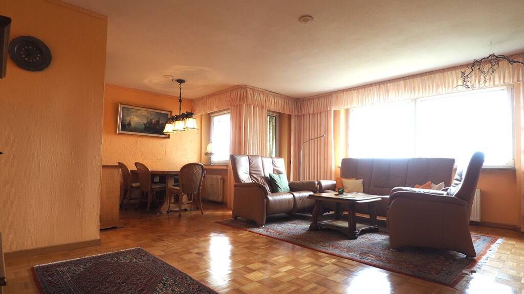 Die Oberböden sind im Wohn- und Esszimmer sowie in den beiden Schlafzimmern in Parkett gehalten, die beiden Sanitärbereiche sind gefliest und in Küche und Flur ist Laminat in Fliesenoptik verlegt. Die Einrichtung der Küche nebst Elektrogeräten kann bei Gefallen übernommen werden!