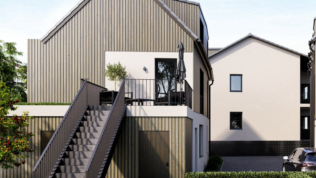 Das Herzstück des Hauses bildet der offene Wohn-, Ess- und Kochbereich. Durch die großen Fensterflächen wirkt dieser Bereich lichtdurchflutet und einladend. Von hier aus führt der direkte Zugang auf die großzügige Terrasse, die zusätzlichen Wohnkomfort im Freien schafft. Ein separates Gäste-WC rundet diese Etage ab.