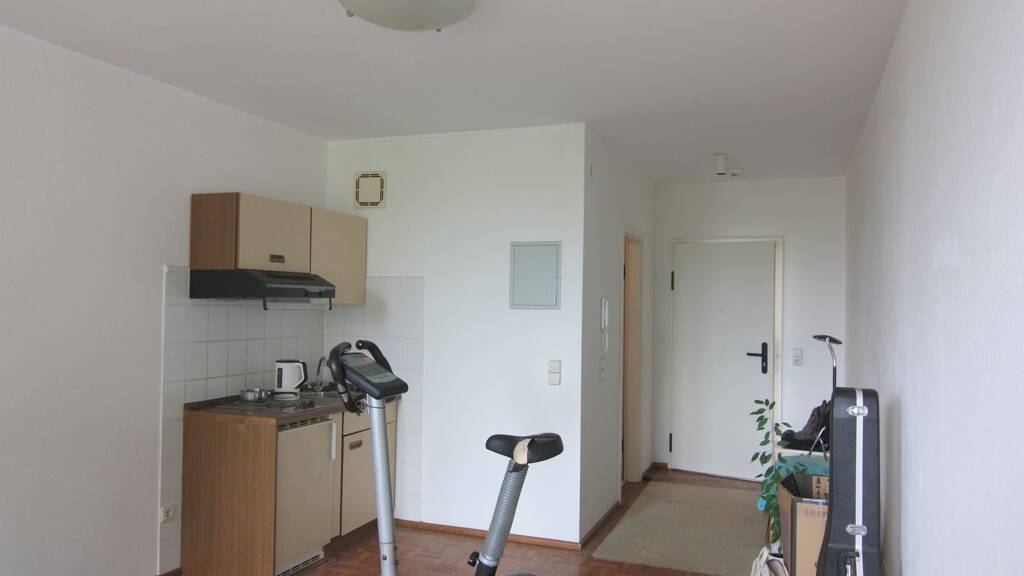 Der gut geschnittene Wohn- und Schlafbereich bietet direkten Zugang zum Balkon, der einen angenehmen Blick ins Grüne und über die Stadt gewährt. Die Kochnische ist funktional gestaltet. Das Duschbad ist hell gefliest und gut belüftet.