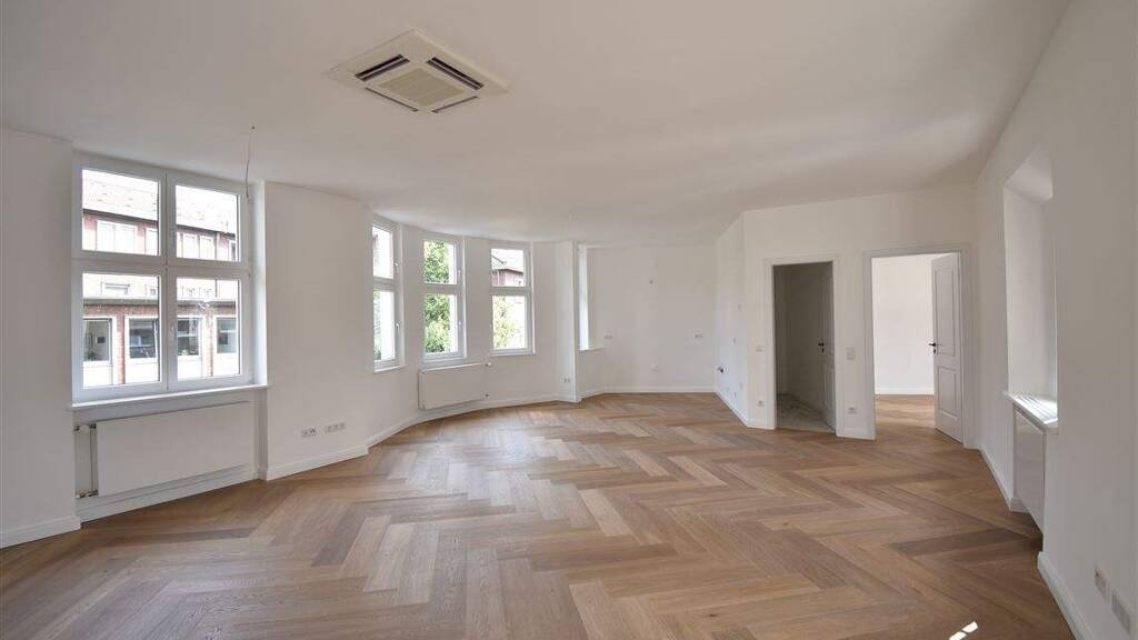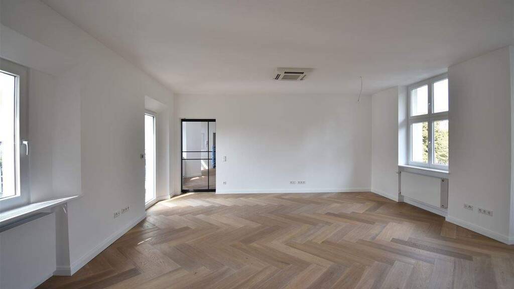 Alle Wohnbereiche sind mit edlem Fischgrät-Parkett ausgelegt, das sich harmonisch in nahezu jedes Einrichtungskonzept einfügt. Beim Betreten der Wohnung gelangen Sie in die helle Diele, die mit modernen Deckenspots und zwei Fenstern ausgestattet ist und so einen einladenden ersten Eindruck vermittelt. Zur linken Seite befindet sich das Wannenbad. Beide Bäder wurden mit exklusiven Fliesen in Marmoroptik sowie eleganten Armaturen in Messing gestaltet. Das zweite Bad, welches über eines der Schlafzimmer zugänglich ist, verfügt über eine großzügige Dusche und natürliche Belichtung durch Fenster. Eine moderne Lofttür mit Glaseinsätzen führt Sie in den Wohn- und Essbereich mit offen gestalteter Küche. Von hier aus haben Sie Zugang zum rückwärtig gelegenen Balkon - ein perfekter Ort zum Entspannen. Ein weiteres Schlafzimmer rundet das Raumangebot dieser besonderen Immobilie ab.