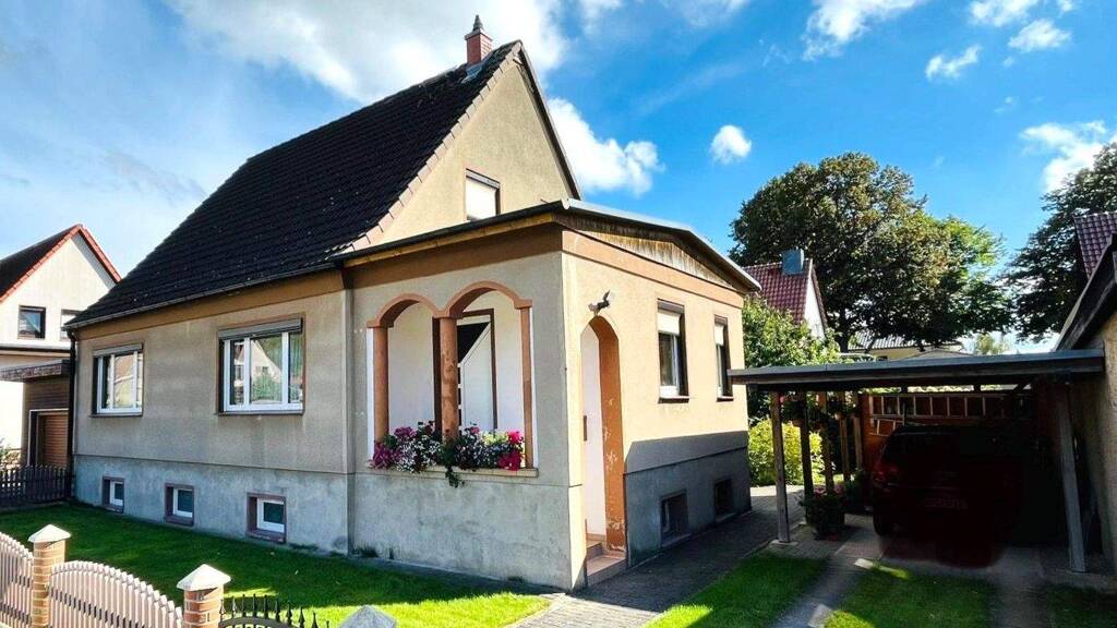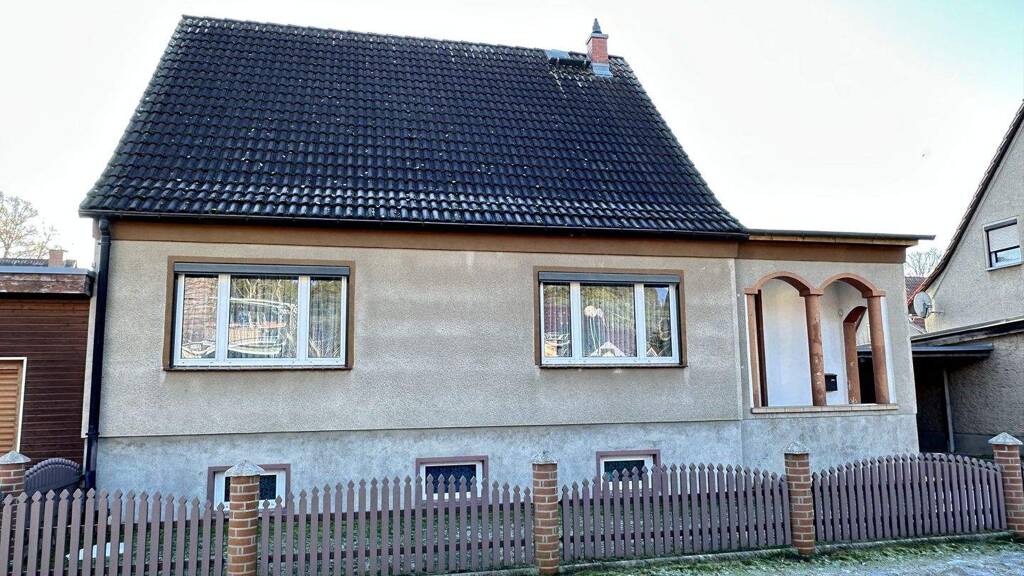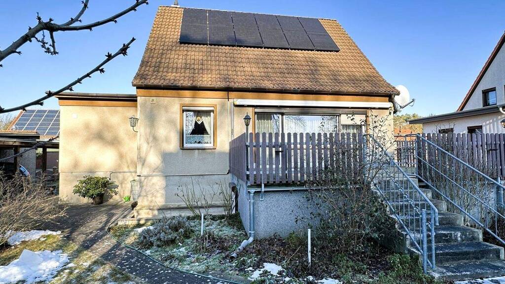 Das Einfamilienhaus wurde 1982 in massiver Bauweise errichtet. Es verfügt über eine Wohnfläche von ca. 137 m², verteilt auf Erd- und Dachgeschoss sowie eine Nutzfläche von ca. 94 m² im Keller. Vom überdachten Hauseingang gelangt man in den Flur, von dem auch das WC mit Dusche zugänglich ist. Weiter geht es in die große Diele, in der sich auch die Treppe zum Dachgeschoss und Keller befindet. Die Diele selbst ist zentral angeordnet, so dass man von hier in das Wohnzimmer mit anschließender Südterrasse, die Küche und das Schlafzimmer gelangt. Im Dachgeschoss kommt man vom kleinen Flur in das Schlafzimmer, die 2 Kinderzimmer und in das moderne Bad mit Wanne und Fußbodenheizung. Im Keller gelangt man vom Flur in das WC mit Waschmaschinen-stellplatz. Gegenüber liegt der erste Kellerraum und daneben ein weiterer zentraler, beheizbarer Raum. Von dort geht es in den Technik- und Heizungsraum und einen weiteren Keller. Zwei weitere Kellerausgänge führen in den Garten und die Garage. Ab 1995 wurde das Objekt umfangreich und fortwährend modernisiert. So wurden die Heizung, die Fenster, die Elektrik (in EG+DG) und die Bäder bereits erneuert. Das Dach wurde 1996 mit Betondachsteinen neu gedeckt. Auch in den Außenbereich wurde investiert: in eine neue Zaunanlage, neues Garagentor, Carport und gepflasterte Zufahrten. Seit Ende letzten Jahres senkt eine PV Anlage die Stromkosten.