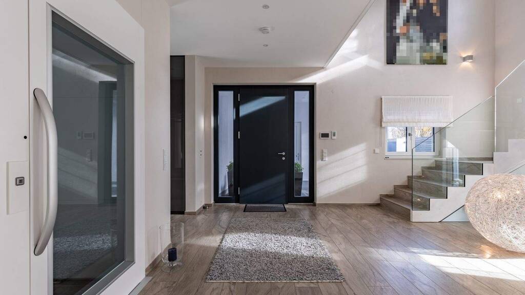Schon das großzügig gestaltete Entree beeindruckt: Ein heller Empfangsbereich mit maßgeschneiderter Garderobe, Gäste WC und einem Aufzug, der alle Ebenen verbindet. Ein besonderer Blickfang ist das zum Obergeschoss hin offen gestaltete Treppenhaus mit umlaufender Treppe und einer Deckenhöhe von etwa sechs Metern. Ein architektonisches Statement, das Raum und Licht eindrucksvoll in Szene setzt.