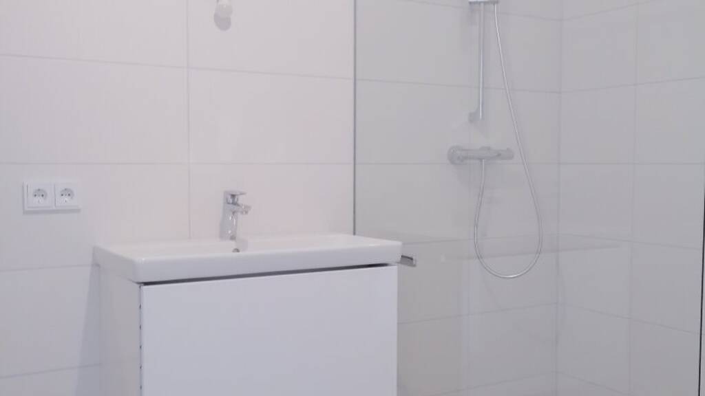 Bad und WC sind mit schicken Fliesen und hochwertigen Möbeln ausgestattet.
