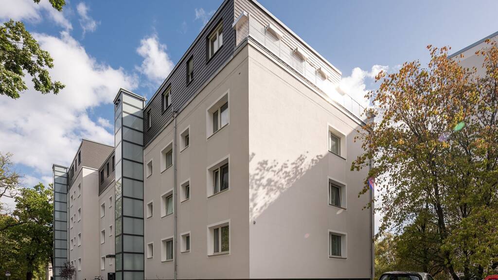 Auf kleinen, gepflasterten Wegen entlang von Bäumen und Blumenbeeten erreicht man die hell verputzten und in moderner Formensprache erbauten Häuser. Die vier Gebäude in diesem Ensemble sind so ausgerichtet, dass sich von den Eigentumswohnungen ein wunderbarer Blick ins Grüne eröffnet. Die im Jahr 2016 und 2017 erbauten Dachgeschoss-Etagen bilden mit ihrem dunklem Anthrazit-Farbton einen modernen, puristischen Kontrasteffekt.