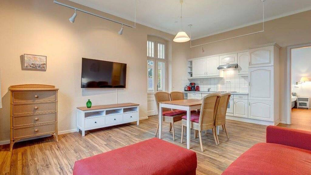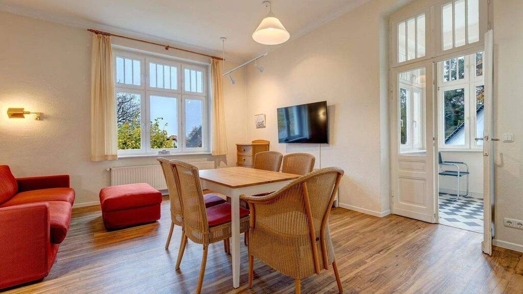 - freistehende historische Villa - etwa 500 m zum Ostseestrand - üppiger Garten (2 Apfelbäume zum Ernten) mit Sitzplätzen, die gemeinschaftlich genutzt werden können - im Haus befinden sich 7 Wohnungen - Wohnzimmer mit Flatscreen-Fernseher, Schlafcouch für 2 Personen und Küchenzeile mit Elektroherd, Geschirrspüler, Kühlschrank Toaster und Wasserkocher - Schlafzimmer mit 2 Einzelbetten nebeneinander, verbunden durch ein gemeinsames Kopfteil (180 x 200 cm) sowie ein weiteres Einzelbett (90 x 200 cm) - Waschmaschine und Trockner befinden sich im Keller und können kostenlos genutzt weden - Wlan steht kostenlos zur Verfügung