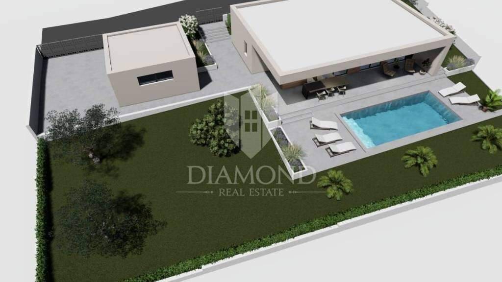 Das einstöckige Haus mit einer Fläche von 150 m² wird unmöbliert verkauft, was es dem zukünftigen Eigentümer ermöglicht, die letzten Details nach seinen eigenen Wünschen zu gestalten. Es bietet ein modernes, offenes Raumkonzept mit zwei Schlafzimmern (jedes mit eigenem Bad), einer zusätzlichen Toilette und einem funktionalen Abstellraum. Das 769 m² große Grundstück umfasst einen Swimmingpool, ein Sonnendeck, eine überdachte Terrasse, eine freistehende Garage und mehrere Parkplätze. Das Haus verfügt über ein Flachdach, PVC-Fenster und -Türen, Fußbodenheizung in den Bädern, Klimaanlagen sowie die ersten Wasser- und Stromanschlüsse.