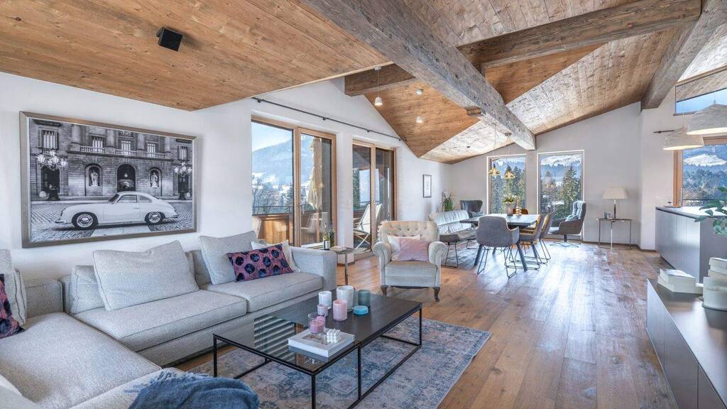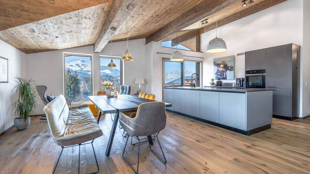 Das gesamte Penthouse wird von einem Sichtdachstuhl aus gehackter Eiche geprägt, der eine warme und stilvolle Atmosphäre schafft. Der großzügige offene Wohn- und Essbereich geht fließend in die drei Balkone über, die den Blick auf die spektakuläre Bergwelt freigeben: