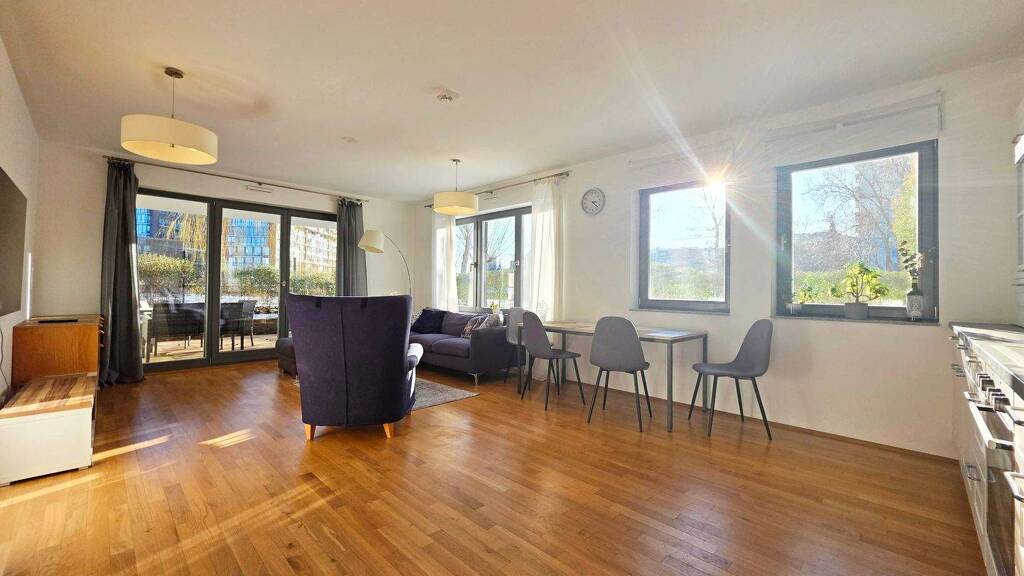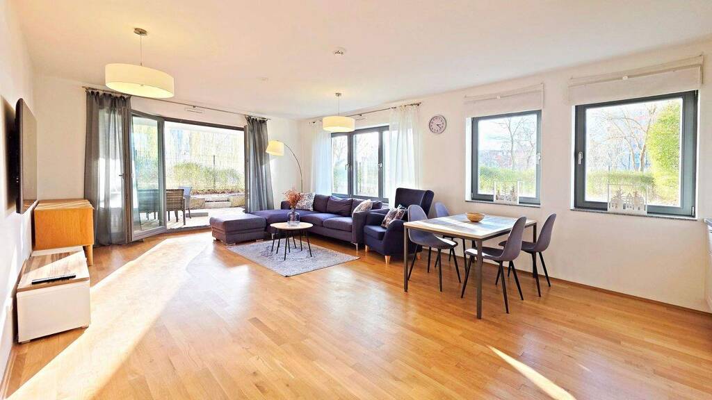 Diese ansprechende, moderne Gartenwohnung mit eigenem zum Süden ausgerichteten Garten, direkt an der Spree in neuer, grüner Wohnanlage (Erstbezug 2018) mit 93 Wohnungen in ruhiger Lage und verfügt über eine gehobene Innenausstattung mit zwei attraktiven, lichtdurchfluteten Zimmern mit Wasserblick!