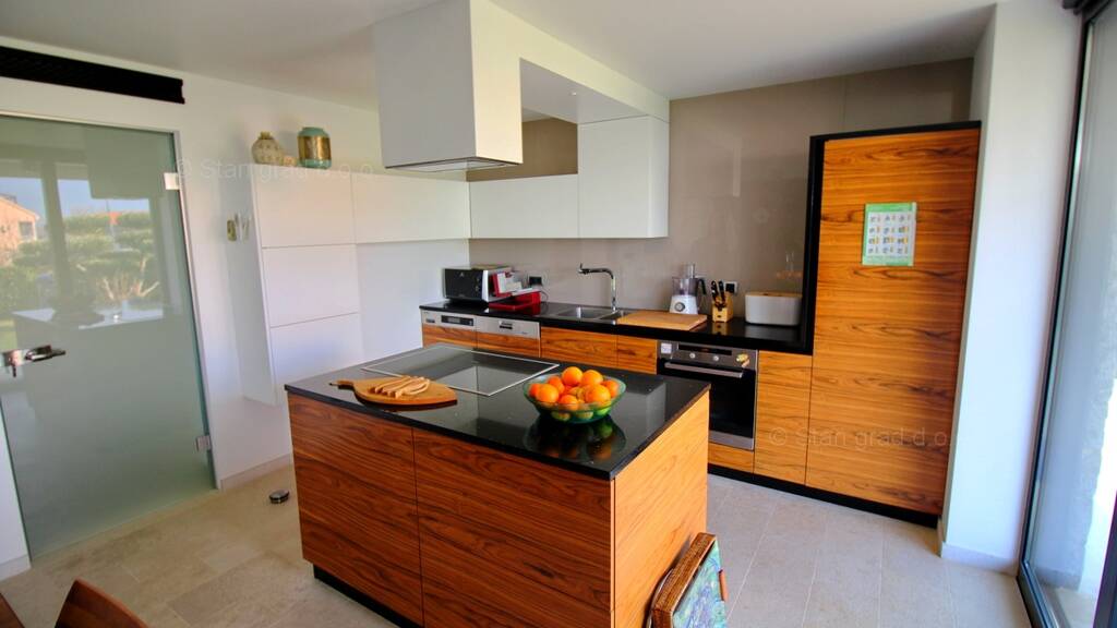Die Wohnung befindet sich im Erdgeschoss und im ersten Obergeschoss eines sehr hochwertigen und gepflegten Gebäudes und verfügt über eine Gesamtfläche von ca. 136 m². Das Erdgeschoss ist direkt von der Garage aus zugänglich und umfasst einen offenen Wohnbereich mit Küche und Esszimmer, ein Gäste-WC sowie den Ausgang in einen wunderschönen Garten mit Sommerküche und Grillplatz. Über eine Innentreppe gelangt man in das Obergeschoss, das drei Schlafzimmer, ein Badezimmer und ein Wohnzimmer mit Meerblick bietet. Der Innenraum der Wohnung ist vollständig mit modernen Designermöbeln und Geräten sowie hochwertiger technischer Ausstattung der neuesten Generation eingerichtet.