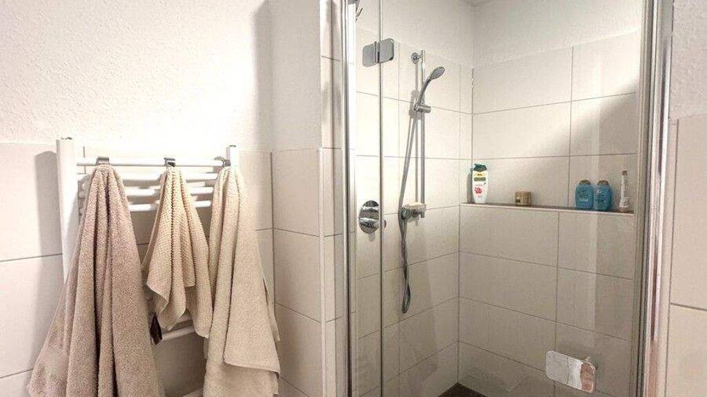 Das Schlafzimmer überzeugt durch eine angenehme Größe und eine ruhige Atmosphäre. Ergänzt wird das Raumangebot durch ein modern gestaltetes Badezimmer mit ebenerdiger Dusche sowie einen Hauswirtschaftsraum mit Anschlüssen für Waschmaschine und Trockner.