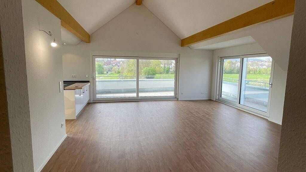 Bei dem zu vermietenden Objekt handelt es sich um eine lichtdurchflutete Penthousewohnung mit ca. 126 qm und einem atemberaubenden Ausblick über die unverbaubare Leinbachaue. Die Wohnung erstreckt sich über das gesamte Dachgeschoss eines Mehrfamilienwohnhauses mit insgesamt sechs Wohneinheiten. Der Fahrstuhl des Hauses fährt direkt in die Wohnung. Zusätzlich gelangen Sie selbstverständlich noch über das Treppenhaus zu Fuß ins Dachgeschoss. In der gesamten Wohnung liegt Fußbodenheizung und die Bodenbeläge sind entweder in Fliesen (anthrazit) oder in Vinyl (Holzdielenoptik) ausgeführt. Die neuwertige Küche beinhaltet einen Kühlschrank, einen Ofen, eine Spülmaschine, ein 4-Platten-Induktionskochfeld sowie Spüle und diverse Unterschränke. Nebenan befindet sich der praktische Abstell- oder Speiseraum. Für Gäste steht eine separate Toilette zur Verfügung. Das Hauptbad sowie das Schlafzimmer sind in einem großen Raum zusammengelegt und verschwimmen miteinander. Von der Schlafzimmerseite hat man Zugang zu der umlaufenden Dachterrasse. Der Badebereich lässt keine Wünsche offen. Es gibt eine begehbare, bodenebene Dusche, eine Wanne, einen Doppelwaschtisch sowie eine weitere Toilette. Zusätzlich gibt es im Bad, neben dem gemeinschaftlichen Waschraum im Untergeschoss, noch einen Waschmaschinenanschluss. Das Highlight der Wohnung bildet der überdimensionale Wohn-/Essbereich, ebenfalls mit Zugang zur Dachterrasse. Der Raum ist bis zum First nach oben offen und vermittelt dadurch einen noch großzügigeren Charakter. Im Untergeschoss gehört ein Kellerraum mit dazu. Im Hof gehört eine Garage (50,00 EUR) sowie ein davor befindlicher Stallplatz (30,00 EUR) mit dazu. Die Kosten für Garage und Stellplatz sind in der ausgeschriebenen Miete bereits berücksichtigt.