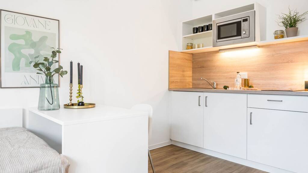 Das 2017 erbaute Apartmenthaus zeichnet sich durch eine moderne und funktionale Ausstattung aus, die ein angenehmes Wohnen garantiert. Die Ausstattungsmerkale umfassen: - Linoleumboden in dem Wohnbereich - Gefliestes Badezimmer mit Dusche oder Duschbadewanne - Schnelles WLAN für effizientes Arbeiten und Surfen - Stromkosten inklusive - keine zusätzliche Kosten für den Stromverbrauch - Heller Wohnbereich mit funktionalen Möbeln (Bett, Schrank, Regale, Schreibtisch mit Stuhl, Beleuchtung) - Küchenzeile (Kochfeld, Mikrowelle, Kühlschrank) - Teilweise mit Balkon - Fahrradstellplätze im Innenhof oder Untergeschoss - Wasch- und Trockenraum mit Maschinen zur gemeinschaftlichen Nutzung - Begrenzte Anzahl an Auto-Stellplätzen, die separat angemietet werden können - sowohl Außenstellplätze als auch eine hauseigene Tiefgarage stehen zur Verfügung - Aufzug - Gegensprechanlage - Hausmeisterservice - Kompakter Kinderspielplatz und Rasenfläche mit Sitzbänken im Innenhof