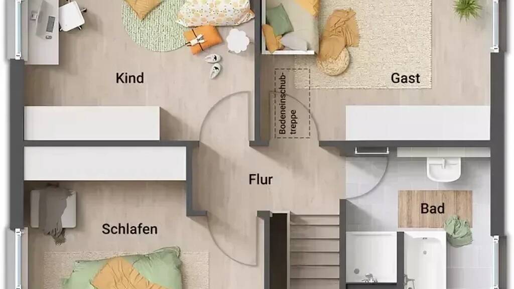 Auch das Obergeschoss zeigt sich im klaren Baustil des Flair 124. Hier befinden sich drei Räume, die Sie als Schlaf-, Kinder-, Gäste- oder Arbeitszimmer nutzen können. Dank großer Fenster wirken alle Zimmer hell und freundlich.